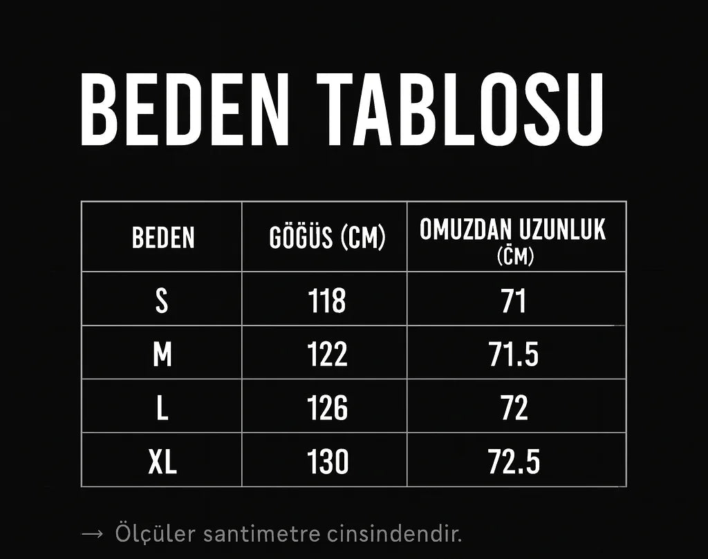 Bu model, oversize (salaş) görünüm için kendi bedeninize tam uyum sağlar. Daha dar ve oturaklı bir görünüm tercih ediyorsanız, bir beden küçük alabilirsiniz. Maksimum rahatlık ve klasik oversize hissi için normal bedeninizi seçmeniz yeterli. Detaylı ölçüler için beden tablomuzu kontrol etmeyi unutmayın.